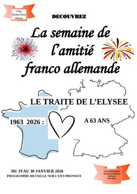 Par admin theodore-monod, publié le jeudi 8 janvier 2026 09:28 - Mis à jour le jeudi 8 janvier 2026 10:58Voici le programme de la semaine de l'amitié franco allemande -