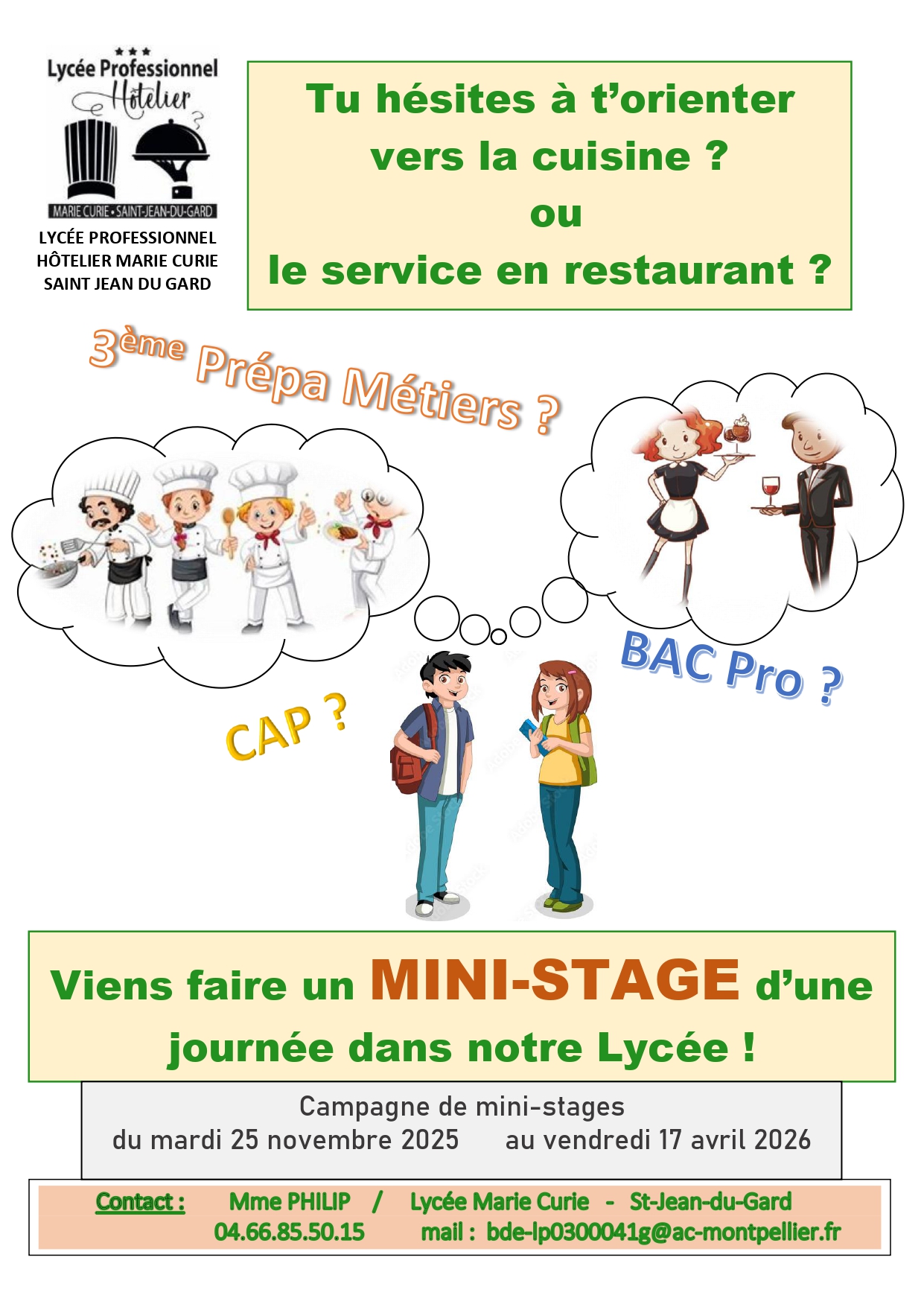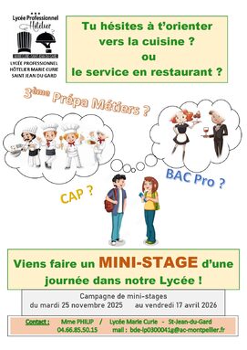 Le Lycée Professionnel Marie-Curie situé à St-Jean-Du-Gard propose un mini stage pour les élèves de 3ème dans les domaines de la cuisine et l'hôtellerie.