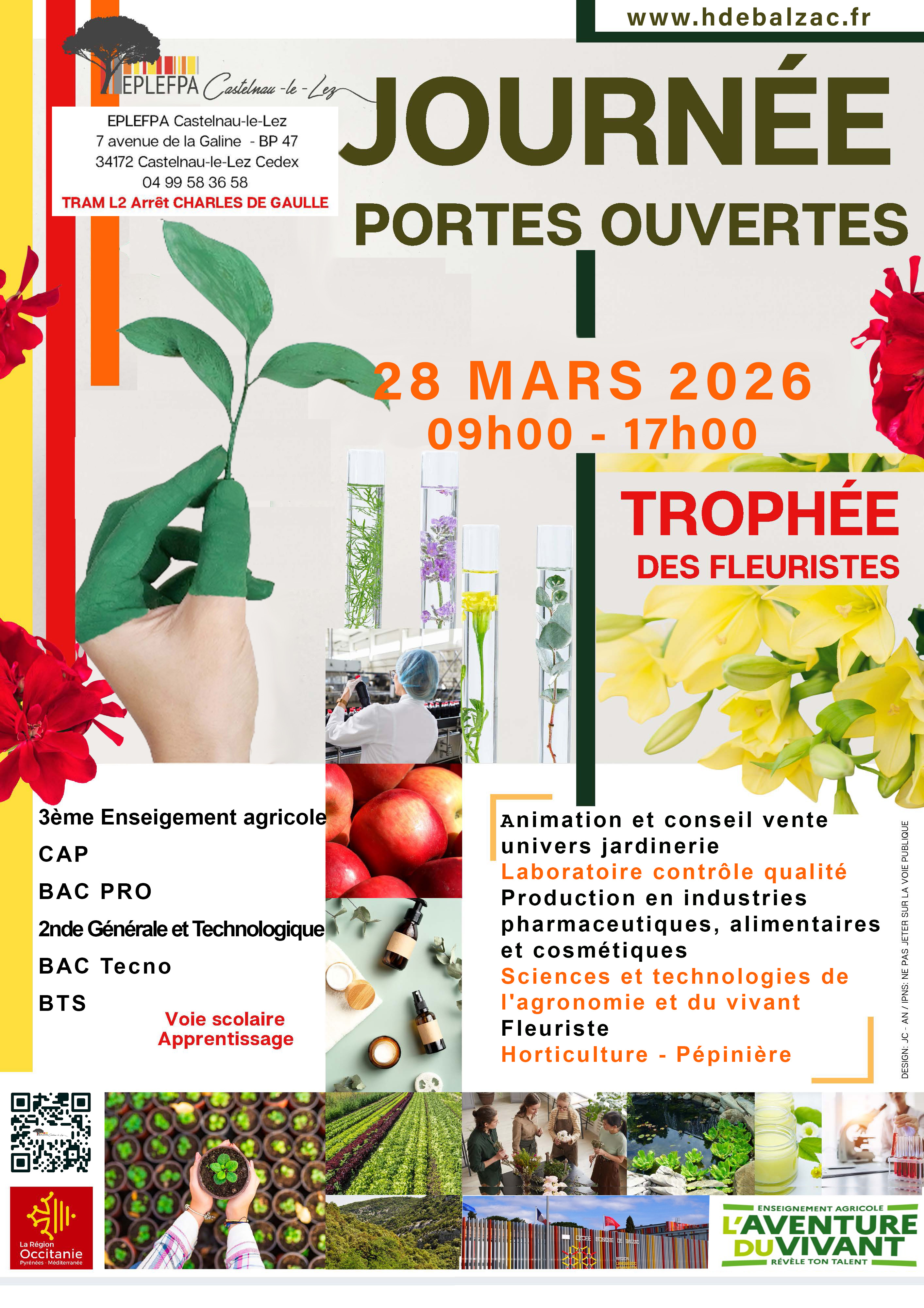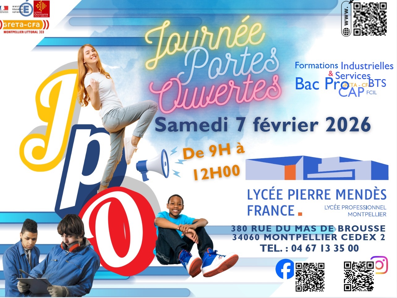 - Lycée Honoré de Balzac de Castelnau le LezSamedi 28 mars 2026 : 09h00 à 17h00 - CFP MFR Garrigues Pic St LoupSamedi 31 janvier 2026 : 9h00 à 12h00 - Lycée Professionnel Voltaire NîmesSamedi 14 février 2026 : 8h30 - 12h30 - Lycée G. De Gaulle Anthonioz MilhaudSamedi 7 février 2026 : 8h30 - 12h30 - Les Compagnons du devoirVendredi 23 Janvier 2026 Inscription ici -> https://docs.google.com/forms/d/e/1FAIpQLSdaFT1S9C1wLrB_Jh4E5KTBCJv3CzaWiwH1UCr3d0ZI2DKcvg/viewform - Lycée Pierre Mendès, MontpellierSamedi 7 février 2026 : 9h - 12h - Lycée Jean-Baptiste DumasSamedi 7 février 2026 : 8h30 - 12h30